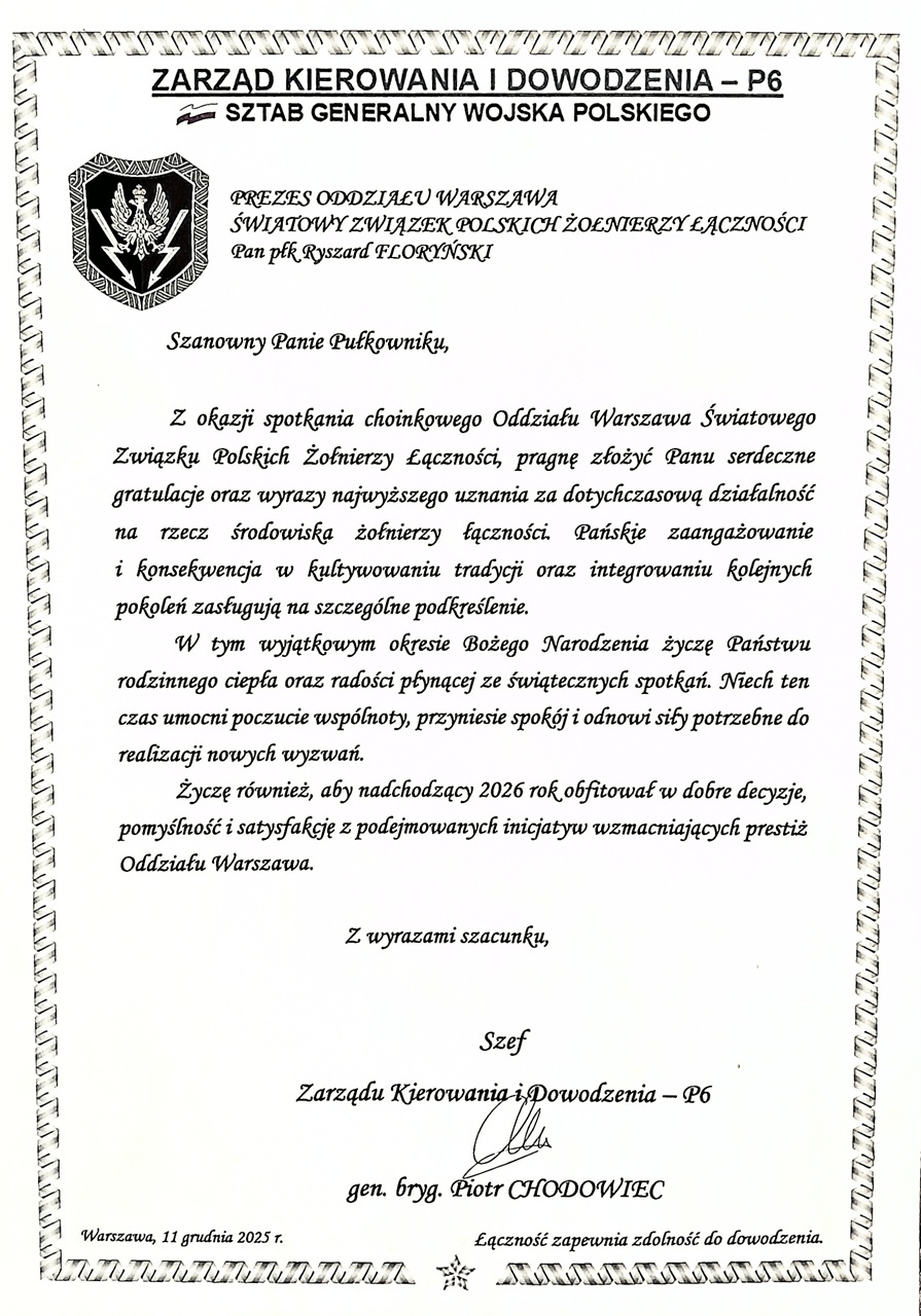 W dniu 11 grudnia 2025 roku, w Hotelu Łazienkowskim, odbyło się doroczne uroczyste spotkanie Choinkowe Oddziału Warszawa. Przybyli na nie zaproszeni goście: Pani senator Anna Aksamit, płk Dariusz Łuczak reprezentujący gen. bryg. Piotra Chodowca, Szefa Zarządu Kierowania i Dowodzenia – P6 Sztabu Generalnego WP, a także Członkowie Honorowi Związku – przyjaciele Oddziału: gen. bryg. Witold Cieślewski i gen. bryg. Wojciech Wojciechowski, Członek Honorowy Związku i członek Zarządu Głównego ŚZPŻŁ - płk. Bogumił Tomaszewski, Członek Honorowy Związku - płk. Marian Jakóbczak, członkowie Oddziału Warszawa z żonami oraz sympatycy Oddziału.